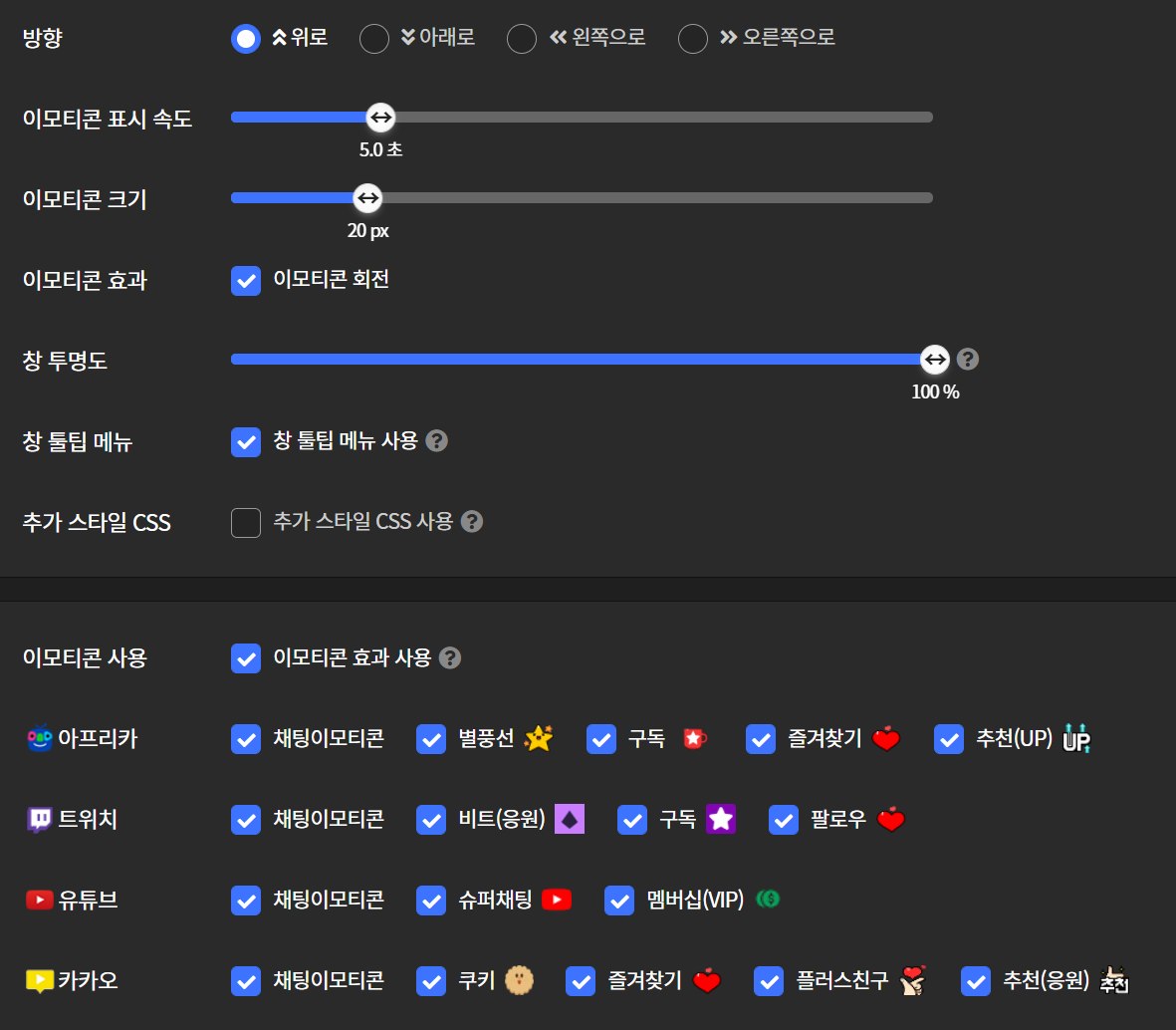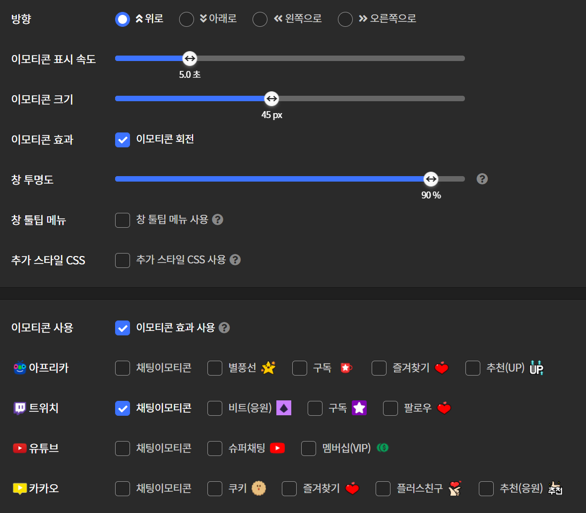 음... 제가 생각한거보단 좀 작고 속도가 너무 빠르네요. 거기다 저 상태면 올라오는 이모티콘이 스트리머 얼굴을 가릴것 같으니까 설정을 살짝 바꿔보겠습니다.