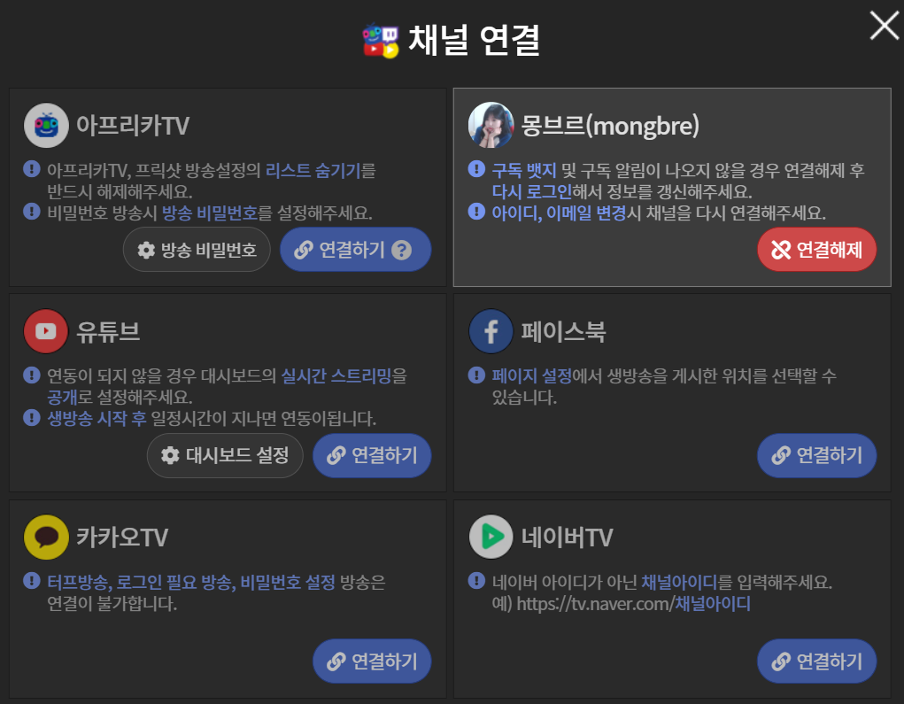 일단 아프리카 도우미 사이트에가셔서 연동 안하신 분들은 트위치 아이디로 로그인 해서 연동해주세요! 일단은 여기서 이모티콘 리액션만 가져다 쓸꺼기 때문에 다른건 신경 안쓰셔도 괜찮습니다.