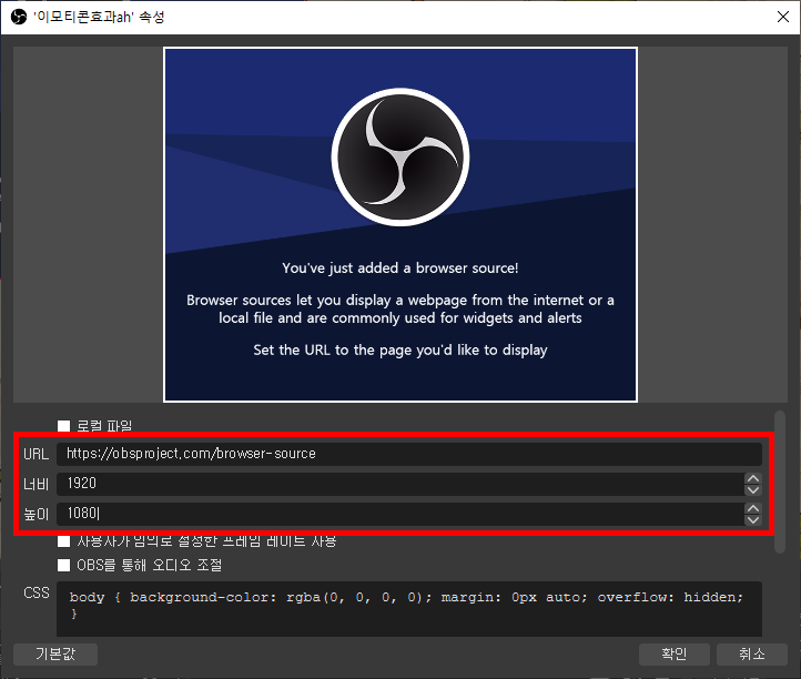 소스목록에 브라우저를 추가하고 이름을 대충 적어준 다음에 URL을 붙여넣기하고 너비와 높이를 적어줍니다. 저는 일단 1920/1080으로 출력 화면크기에 맞춰서 해봤습니다.