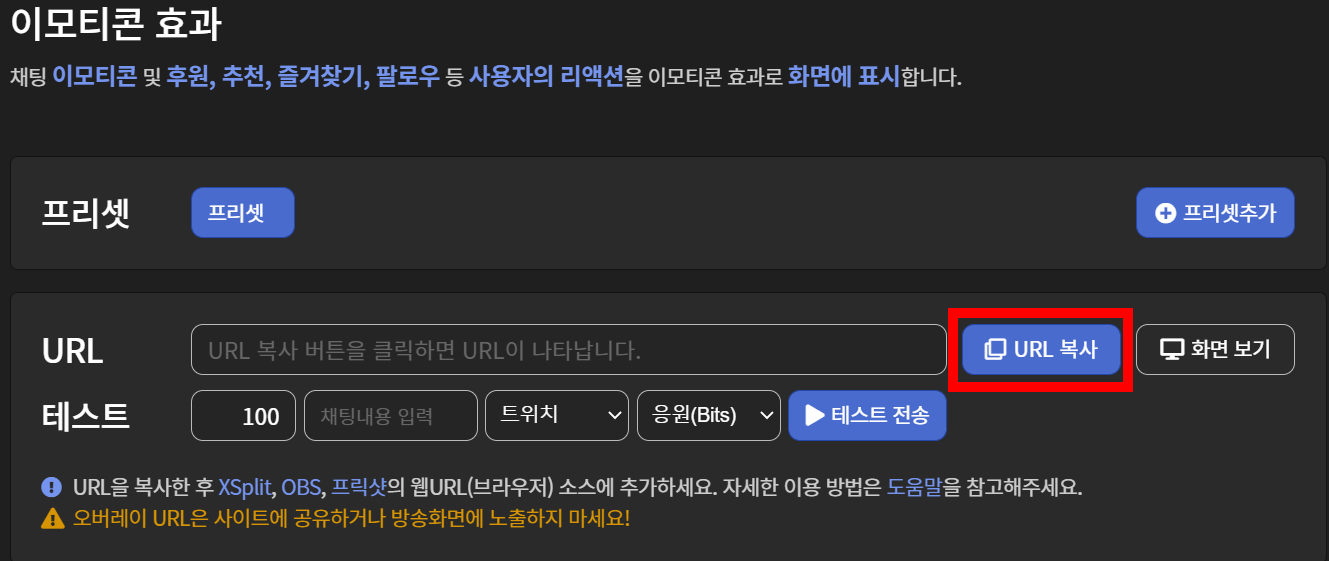 자 우린 성격 급하니까 세세한 설정은 때려치고 일단 되는지 부터 해봅시다. URL복사를 누르고 OBS로 이동해서 브라우저 소스를 추가해봅시다.